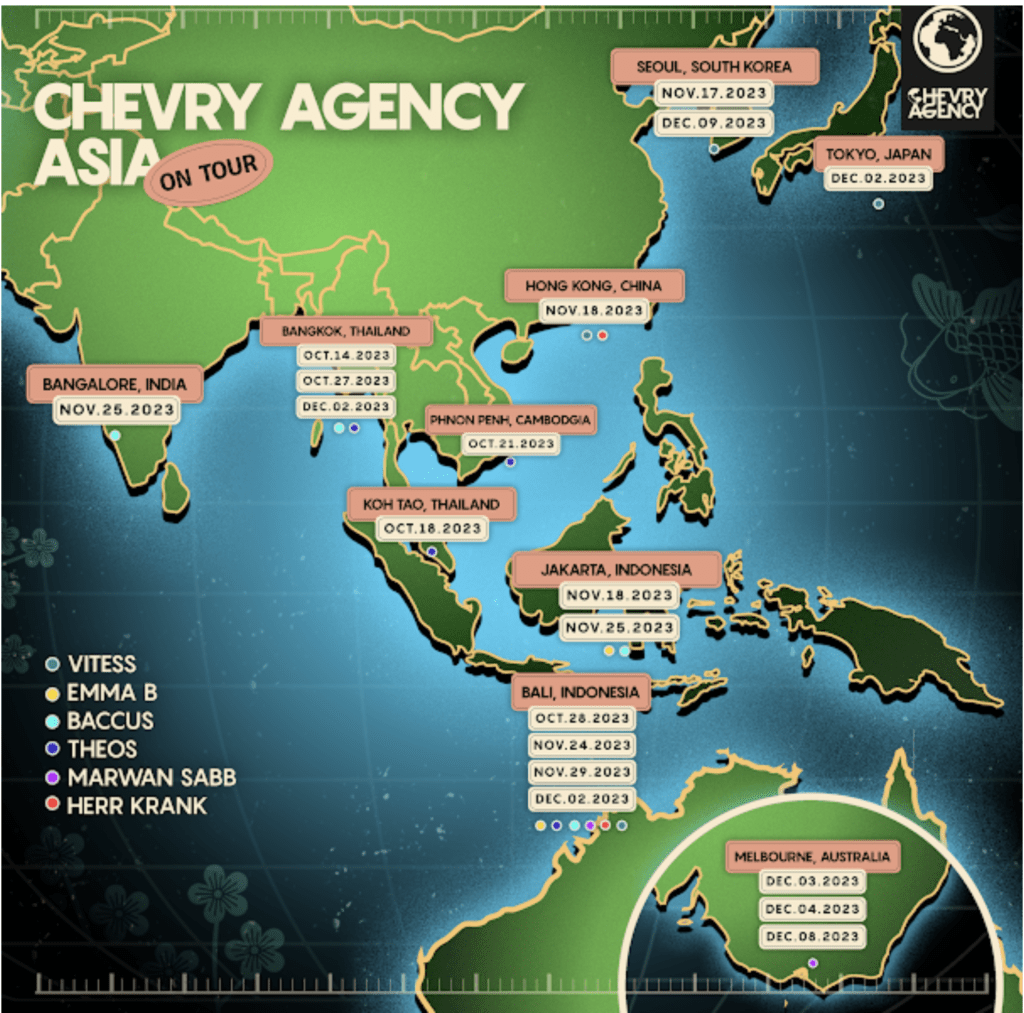 Well established on the French scene, the agency continuously ramps up its event production in Paris, often featuring one or more special guest artists. The year 2023 was also marked by the expansion of its showcases across France and Europe, with stops in Marseille, Toulon, London, Ibiza, Geneva, Barcelona, and beyond, including international tours planned in North and South America, Asia, and Oceania (see map below).
